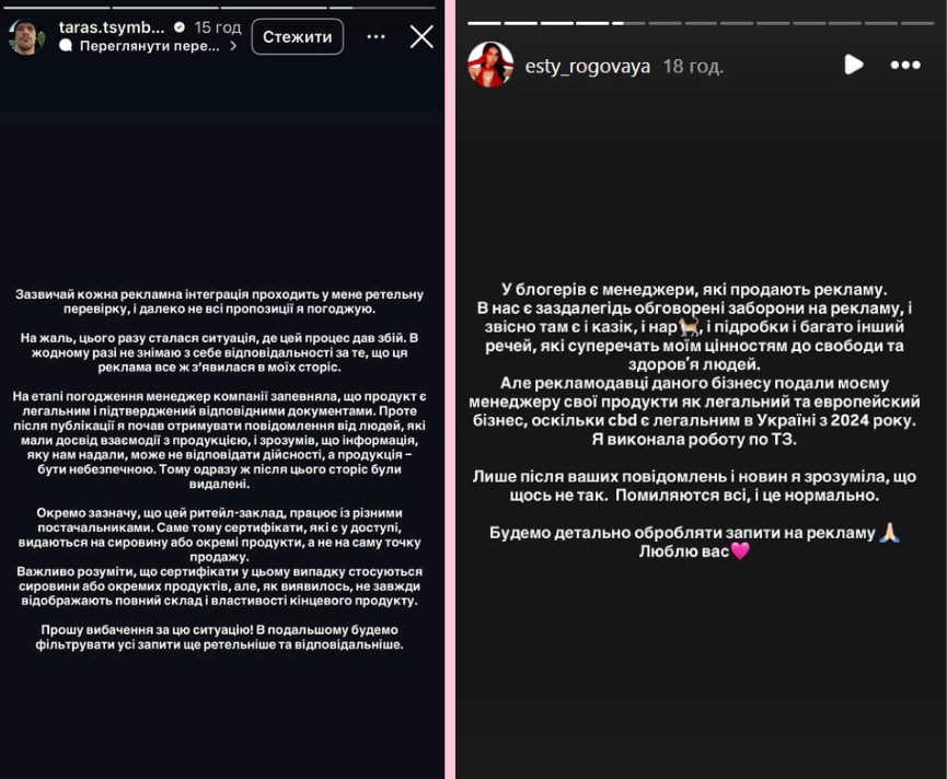 Актор додав, що спочатку все було прозоро, а сам продукт, за його словами, позиціонували як такий, що містить значний відсоток CBD — речовини, яка легалізована в Україні. Утім, дуже швидко після поширення сториз він почав отримувати тривожні повідомлення від людей, які знали правду про бренд компанії.