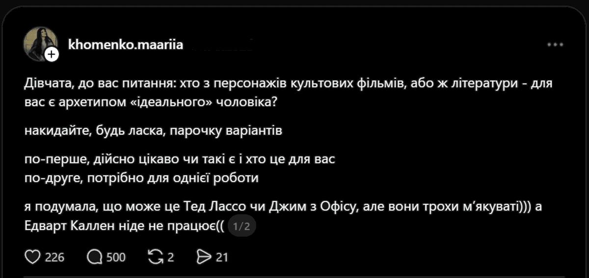 Дівчата, до вас питання: хто з персонажів культових фільмів, або ж літератури - для вас є архетипом "ідеального" чоловіка? Накидайте, будь ласка, парочку варіантів. По-перше, дійсно цікаво, чи такі є, і хто це для вас... Я подумала, що може це Тед Лассо чи Джим з "Офісу", але вони трохи мʼякуваті. А Едвард Каллен ніде не працює,