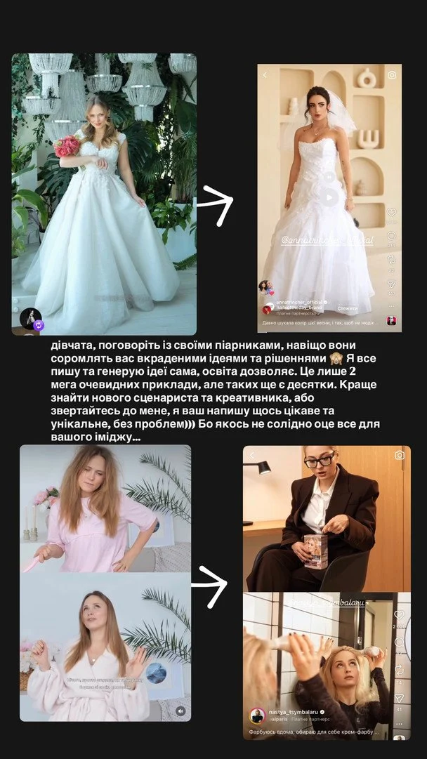 Кошмал звернулася до блогерок із закликом звернути увагу на роботу своїх команд. Мовляв, подібні "запозичення" лише шкодять їхній репутації. Вона навіть навела конкретні приклади — зокрема, рекламу засобів для волосся, яка майже повторює її власний ролик, а також відео у весільному образі, що з’явилося незабаром після її аналогічної публікації.