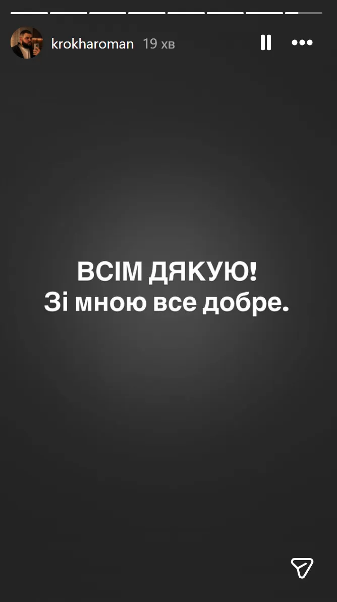 Сам Роман Крохін також вийшов на зв’язок і повідомив, що з ним усе добре. За попередніми даними, аварія сталася в ніч на 13 квітня поблизу ЖК "Варшавський" у Києві, де автомобіль врізався в припарковану машину. На щастя, внаслідок інциденту ніхто не постраждав.