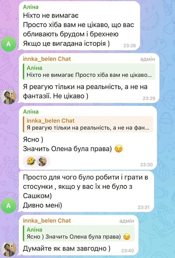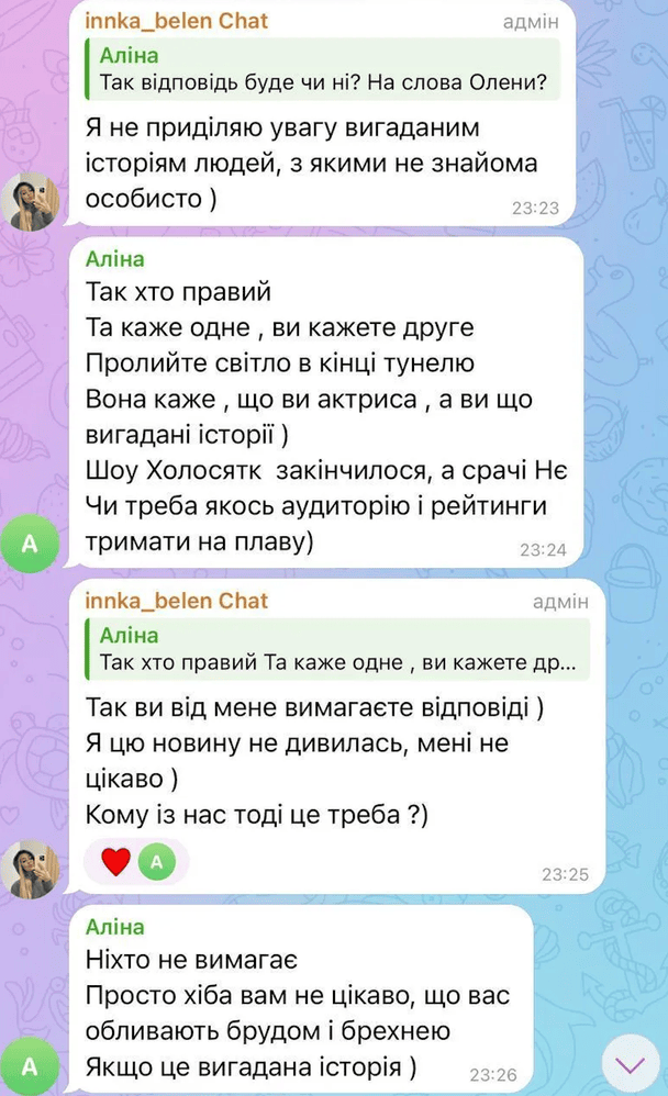 Така заява приголомшила підписників, адже Бєлєнь досі ділиться особистими переживаннями після болісного розриву з Тереном і розповідає, як сильно він її образив. У своєму Telegram-каналі Інна вирішила не розпалювати конфлікт і спокійно відповіла на звинувачення. Вона зазначила, що не бачить сенсу реагувати на те, що, на її думку, є вигадками сторонніх людей.