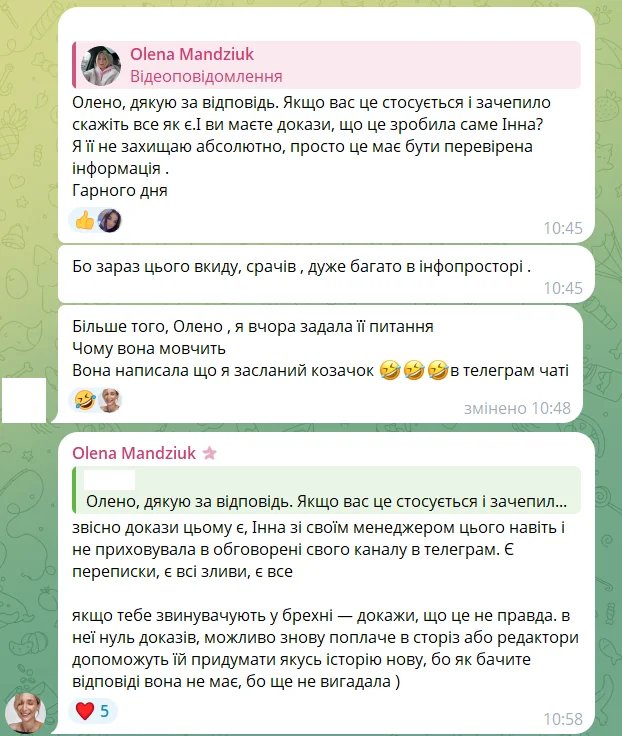 Мандзюк також зазначила, що мовчала б про вигадані стосунки Терена та Бєлєнь, якби Інна не намагалася самоствердитися, використовуючи її ім’я. Ба більше, Олена є докази, що Інна плела навколо неї та Олександра інтриги.