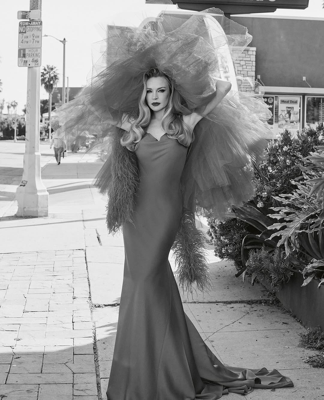 На одному з кадрів зірка зазнімкована у чорній сукні з бантом у зоні декольте та вставкою кольору слонової кістки від Maison Valentino, яку вона поєднала з чорним капелюхом з фатину від BUERLANGMA. На іншому Лохан приміряла чорний шкіряний жакет від PATOU та червоний головний убір від Sarah Sokol Millinery. На обох світлинах її волосся укладене в красиві хвилі, а на обличчі макіяж з темно-червоною помадою.