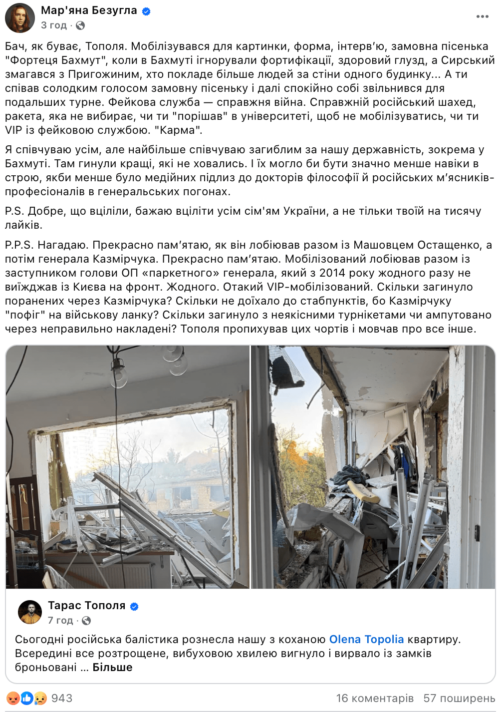 Українське суспільство знову сколихнула заява народної депутатки Марʼяни Безуглої в Facebook. Цього разу обʼєктом її глузувань став музикант Тарас Тополя, чия родина нещодавно пережила справжнє пекло — їхнє помешкання в Києві було понівечене під час ракетного удару росіян.