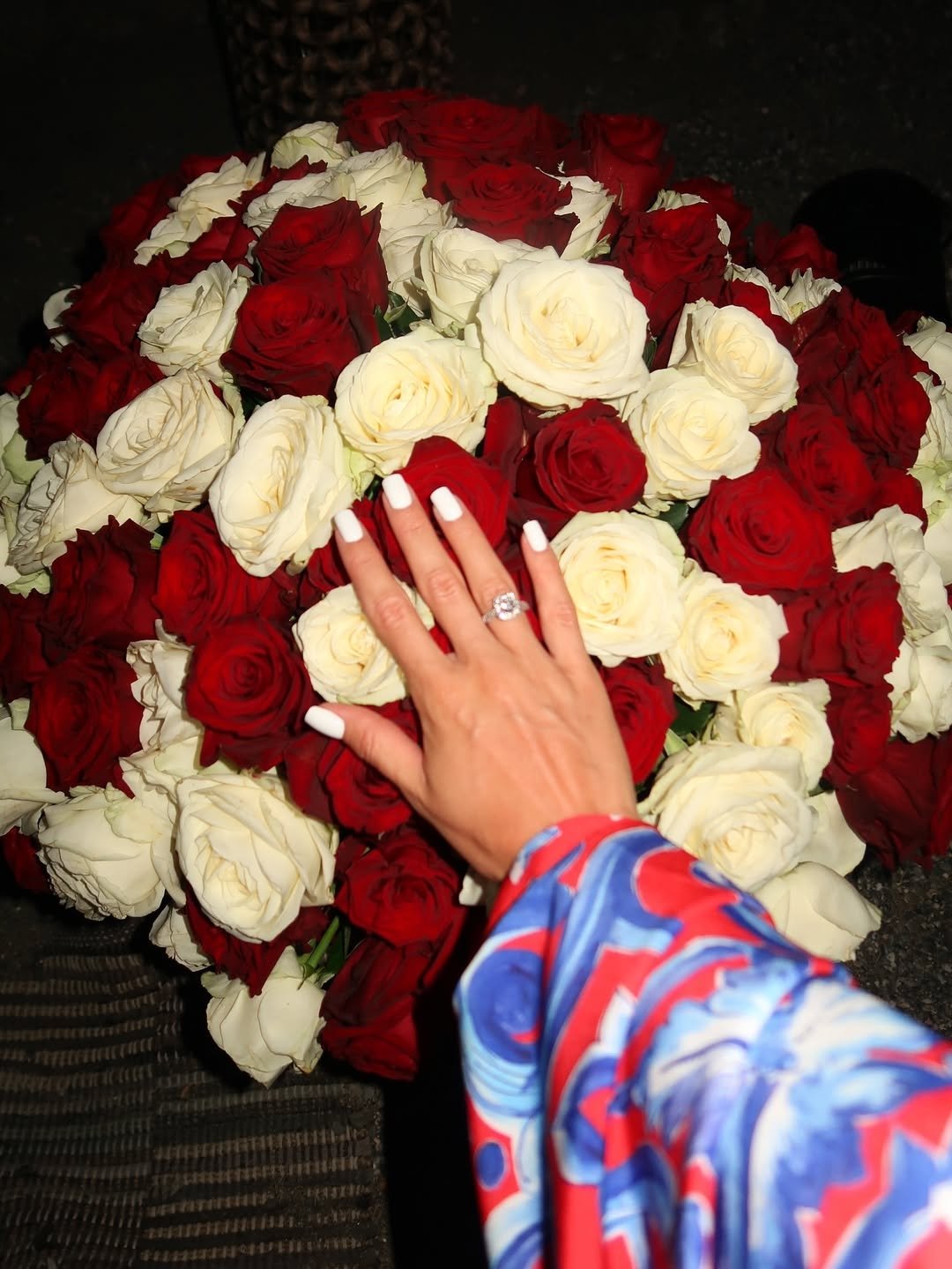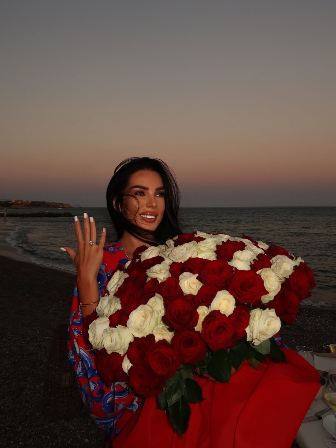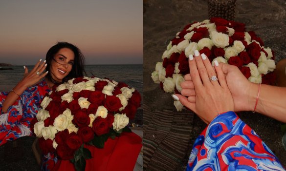 На опублікованій серії фото 29-річна Іванна зображена на тлі узбережжя під час заходу сонця. Вона показала розкішний букет троянд червоного та білого кольорів, а також діамантову каблучку.