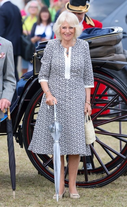 Цього дня на Її Величності була красива темно-синя мідісукня у білий квітковий принт. Доповнили образ світло-бежеві туфлі, плетена сумка у кольорі слонової кістки, прозора парасолька-тростина та прикраси - каблучка, браслети, підвіски та сережки. Королева Камілла зробила фірмове укладання та макіяж.