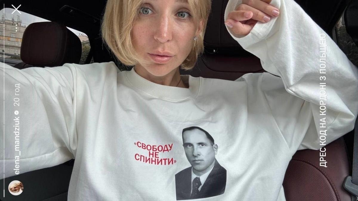 Олена Мандзюк, яка закликала бити російськомовних дітей, цього разу викликала хвилю критики після фото з подорожі до Польщі. Вона показала кадр, де позує в авто у білому світшоті з портретом Бандери та написом "Свободу не спинити", підписавши його: "Дрес-код на кордоні з Польщею".
