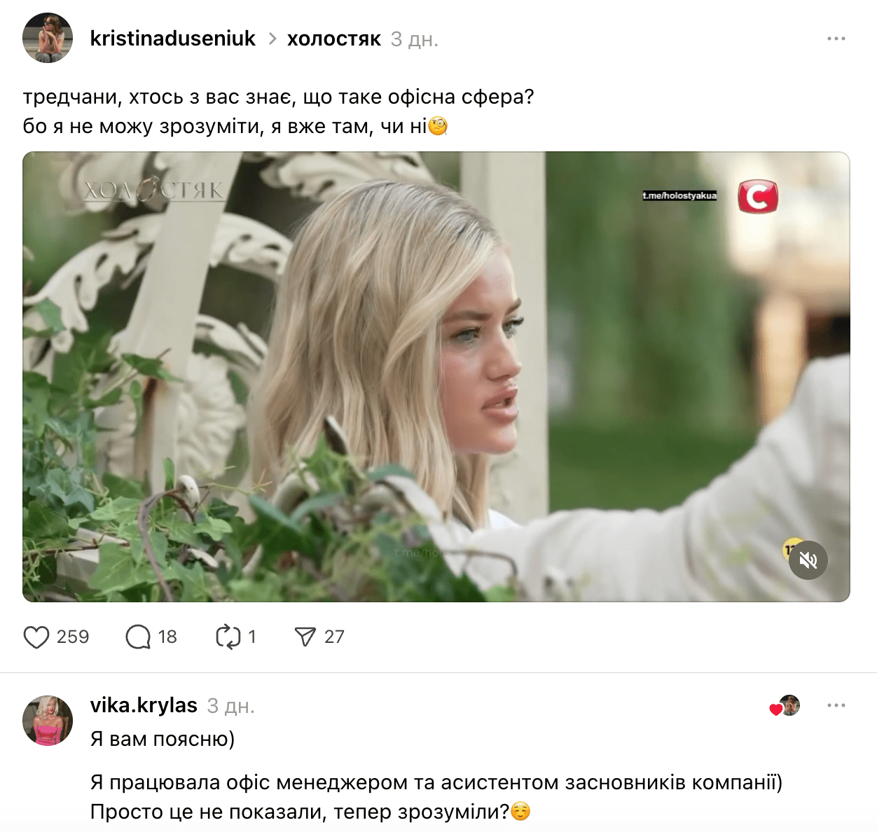 На шоу "Холостяк-14" Вікторія Крилас заявила, що працювала в офісній сфері, чим викликала хвилю критики в Мережі. Користувачі впевнені, що дівчина працювала в так званих "офісах", де людей "розводять" на гроші. Однак усі звинувачення дівчина спростовує й наголошує, що вона просто працювала асистентом засновників компанії.