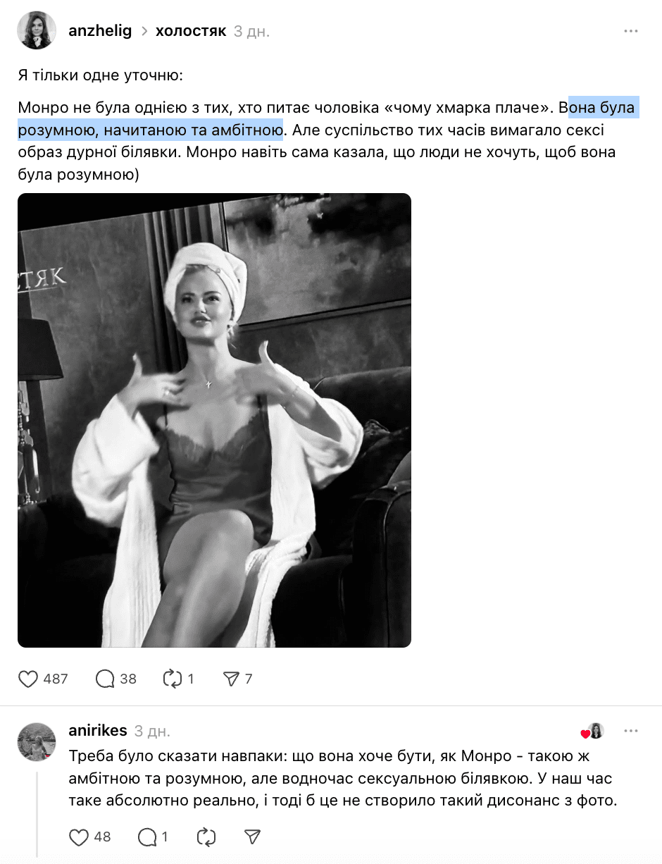 Ще один скандальний момент пов’язаний з тим, що Вікторія каже, що її часто порівнюють із Мерилін Монро. Дівчина наголошує, що за її привабливою зовнішністю ховається історія боротьби й внутрішнього зростання. Однак в Мережі за такі порівняння ексучасницю "Холостяка" засуджують, мовляв, вона принижує культову актрису, яка насправді була розумною, начитаною та амбітною.