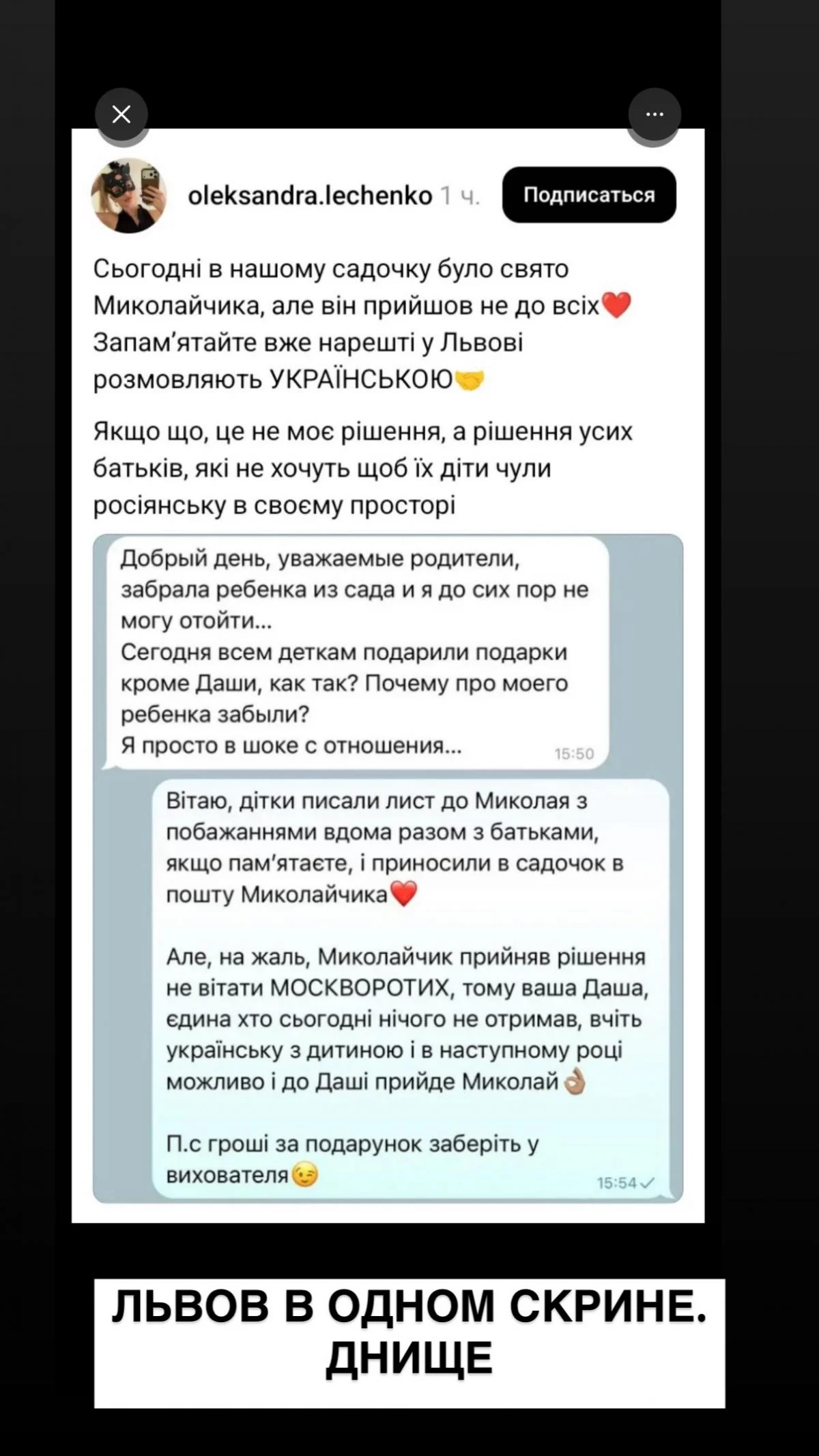 Алхім опублікувала в Instagram скриншот із Threads, де анонімна користувачка стверджувала, що її дитину нібито не привітали з Днем святого Миколая через її російську мову. У пості йшлося, що інші батьки спільно ухвалили таке рішення, а матері малечі порадили "вивчити українську, щоб наступного року теж прийшов Миколай".