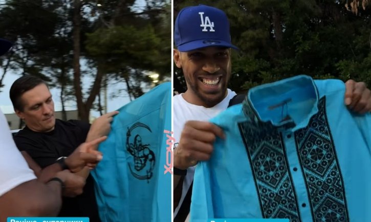 Чемпіон світу у надважкій вазі за версіями WBC, WBA та IBF Олександр Усик подарував своєму колишньому супернику Ентоні Джошуа красиву вишиванку лазурового кольору з чорною вишивкою. Так символічно український боксер підтримав британського колегу напередодні його поєдинку з блогером Джейком Полом.