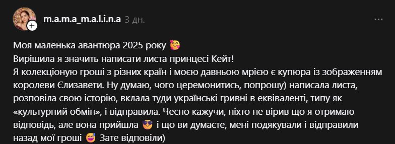 У своєму блозі в Threads Ліна розповіла, що вирішила піти на сміливий крок: вона надіслала до Лондона українські гривні, а натомість попросила банкноту із зображенням покійної королеви Єлизавети II. Невдовзі дівчина отримала офіційну відповідь з Офісу принца та принцеси Уельських.