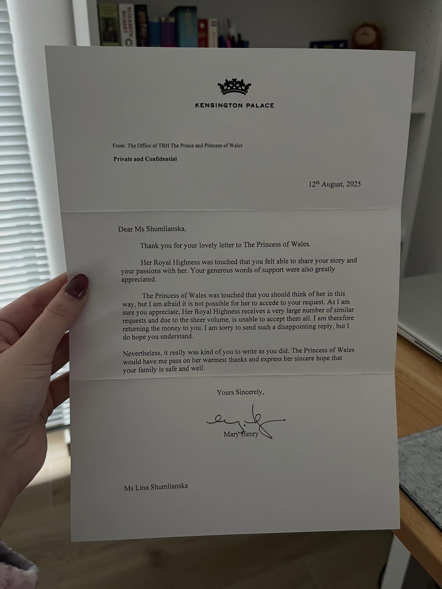 Лист, який отримала Ліна Шумлянська, був підписаний Мері Генрі — особистою секретаркою Міддлтон. Однак прохання українки виконати не змогли через велику кількість подібних запитів. Також пояснили, що родина не може отримувати особисті речі своїх шанувальників, окрім малюнків і листівок. Натомість вкладені в конверт гривні повернули назад. Але принцеса Уельська була зворушена зверненням й побажала миру для родини дівчини: