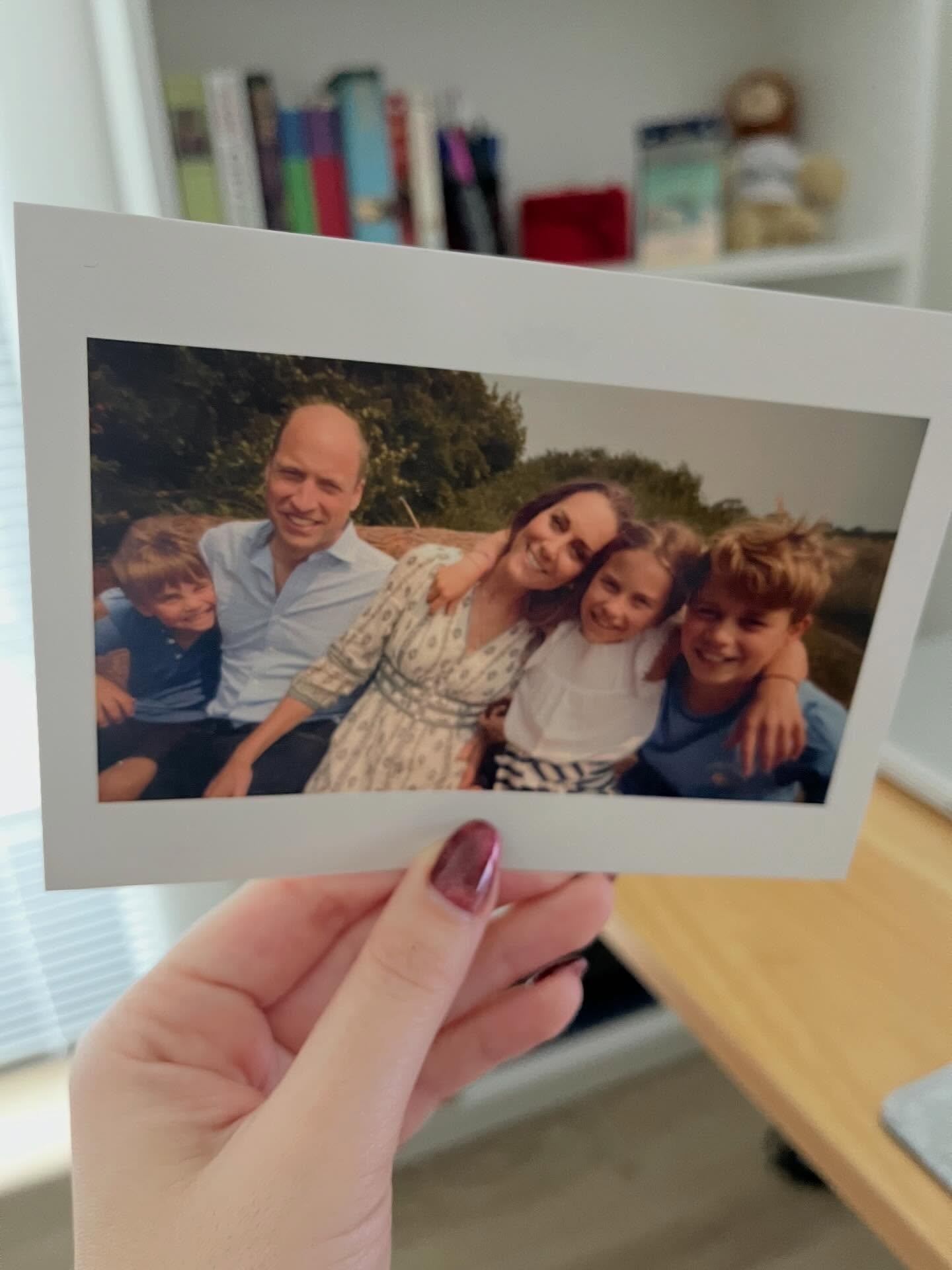 Також конверт був не порожнім. У ньому був особливий подарунок — фото з родиною Уельських: усміхнені принц Вільям, Кейт Міддлтон і їхні діти — принци Джордж і Луї та принцеса Шарлотта.