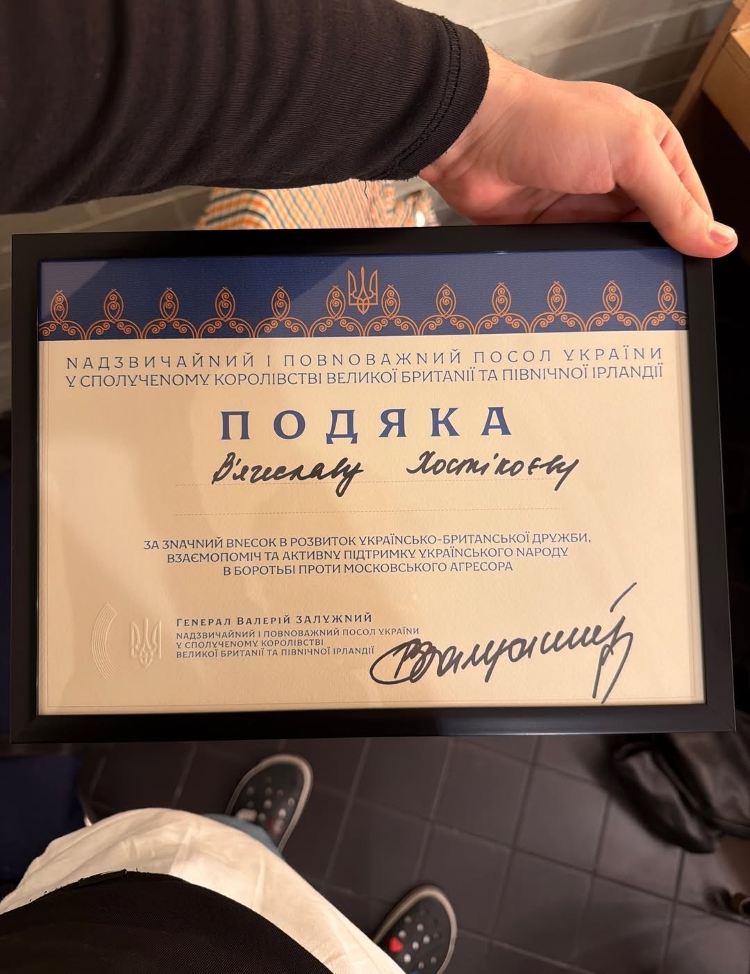Хостікоєв продемонстрував підписаний Валерієм Залужним лист подяки “за значний внесок в розвиток українсько-британської дружби, взаємопоміч та активну підтримку українського народу в боротьбі проти московського агресора”, а також символічні коїни👇: