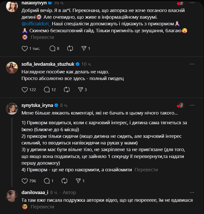 Після хвилі зауважень блогерка видалила відео, однак користувачі в Threads встигли зберегти запис екрана та продовжили активно обговорювати ситуацію. У дописах українці висловлювали занепокоєння безпекою дитини, наголошуючи, що під час годування важливо стежити за положенням малюка та швидкістю реакції у разі небезпеки.
