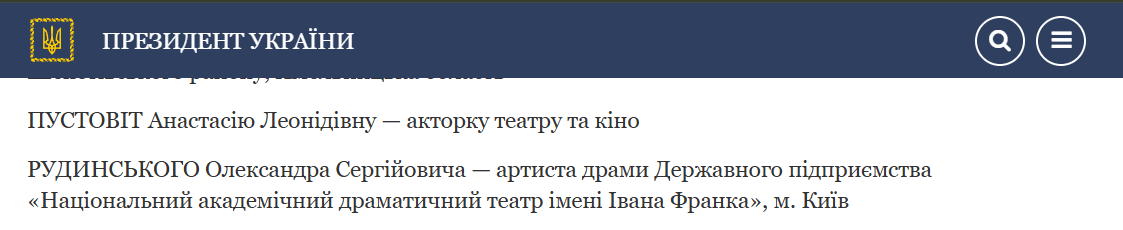 До чергових роковин повномасштабної війни Володимир Зеленський відзначив діячів української творчості. Відомі українські актори Олександр Рудинський, який знявся в новому серіалі “Повернення”, та Анастасія Пустовіт отримали державні нагороди за зміцнення української державності.