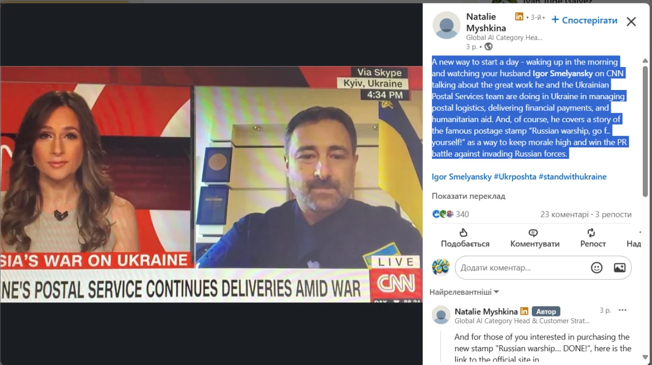 Новий спосіб почати день – прокинутися вранці й побачити, як чоловік Ігор Смілянський виступає на CNN і розповідає про велику роботу, яку він і команда "Укрпошти" роблять в Україні. Гордість. Подяка. І неймовірне відчуття того, що поряд людина, яка разом зі своєю командою робить по-справжньому важливу справу,