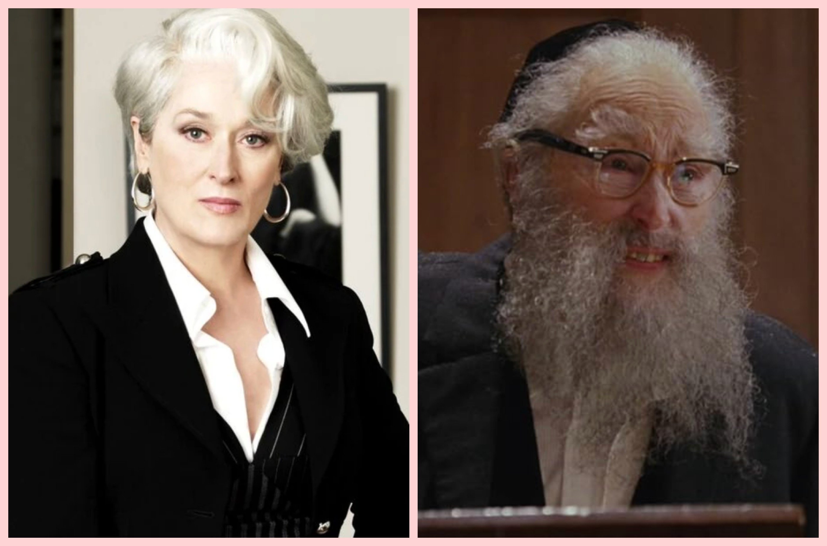 У мінісеріалі "Ангели в Америці" Меріл Стріп продемонструвала справжню акторську багатогранність, виконавши одразу кілька ролей. Серед них — літнього рабина, для якого їй довелося повністю змінити зовнішність. Складний грим і пластичні накладки допомогли створити переконливий чоловічий вигляд.
