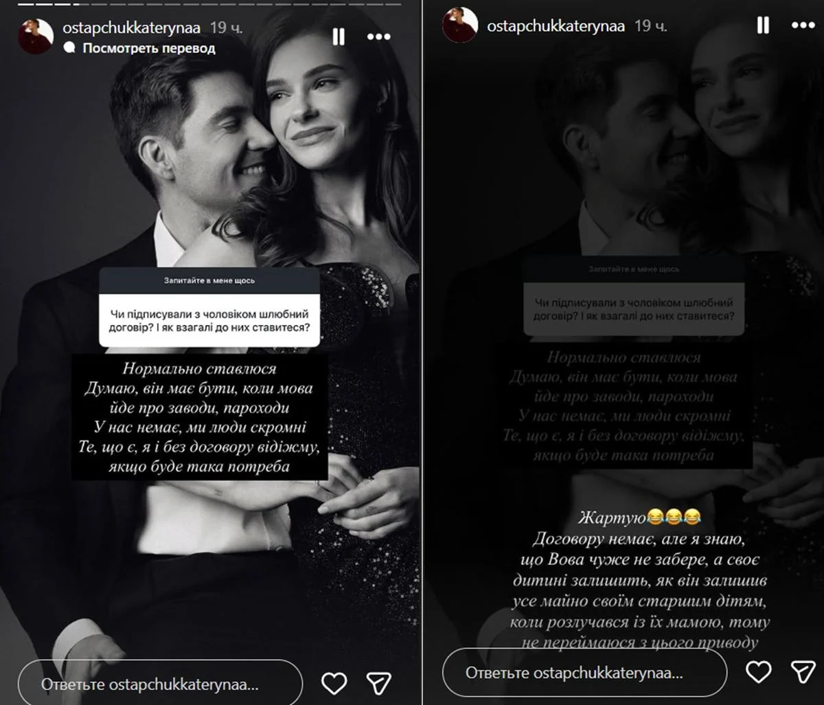 Дружина шоумена зізналася, що загалом позитивно ставиться до шлюбних договорів. Але вважає їх доречними переважно тоді, коли йдеться про великі статки чи серйозний бізнес.