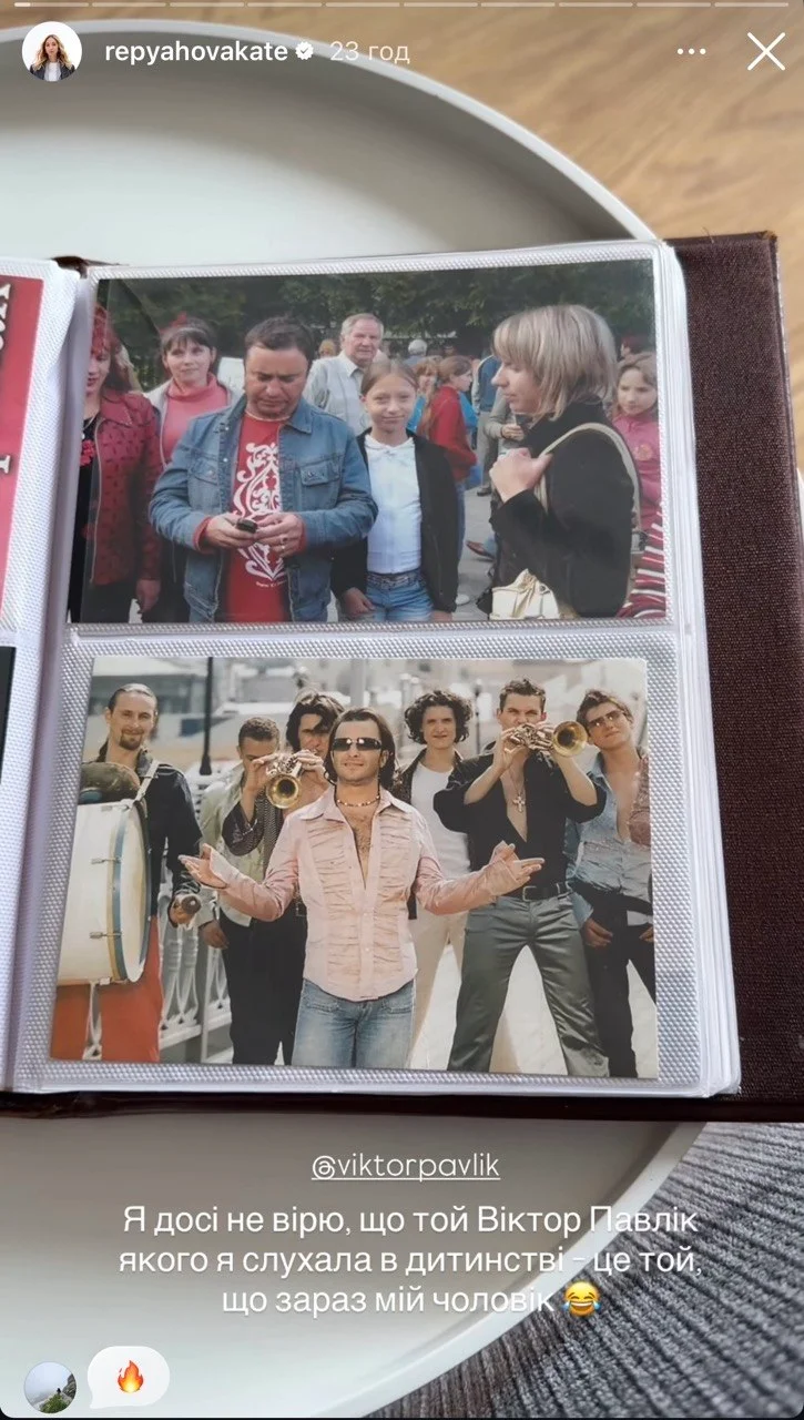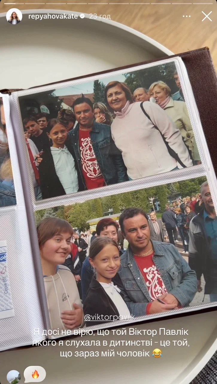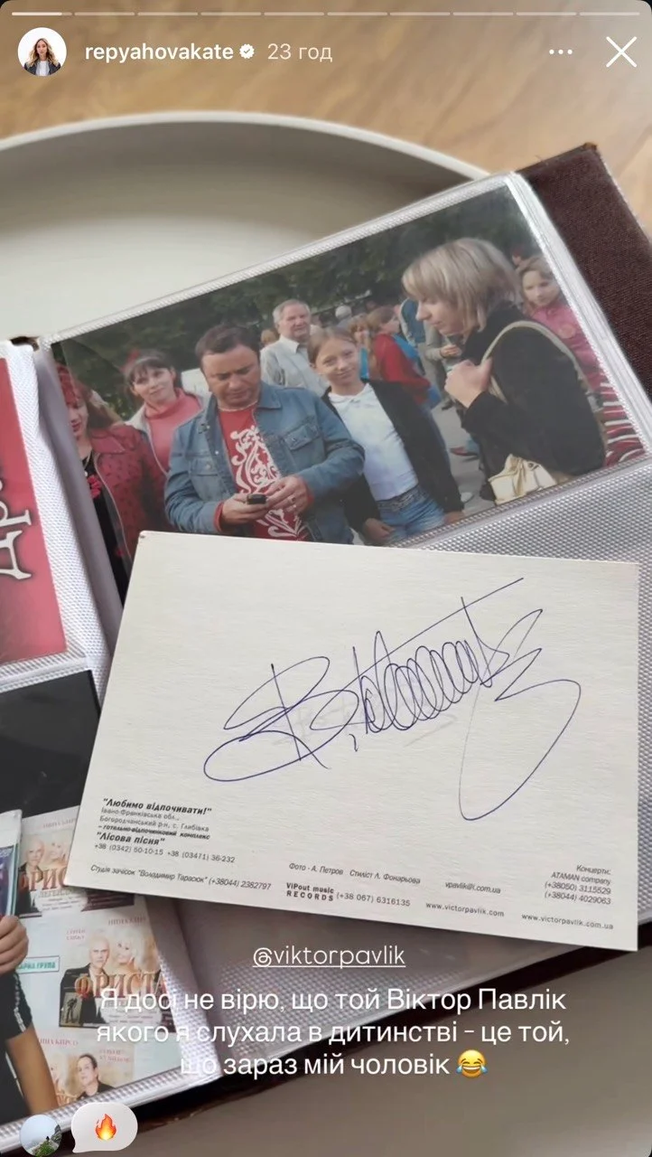 Про знахідку Репяхова розповіла у своїх соцмережах, показавши старі альбоми. На знімках – квитки на концерти, автографи і спільні фото з артистом, які вона зберігала ще з юних років. Один із кадрів особливо вразив: маленька Катя стоїть поруч із Павліком, поки той дивиться у телефон.