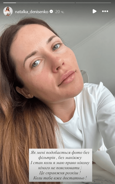 Денисенко відмовилася від макіяжу та фільтрів, щоб показати себе такою, якою вона є. Так, жінка вражає чистою та гладенькою шкірою й пухкими губками. Її волосся також було без укладки - просто вільно спадало на плечі.