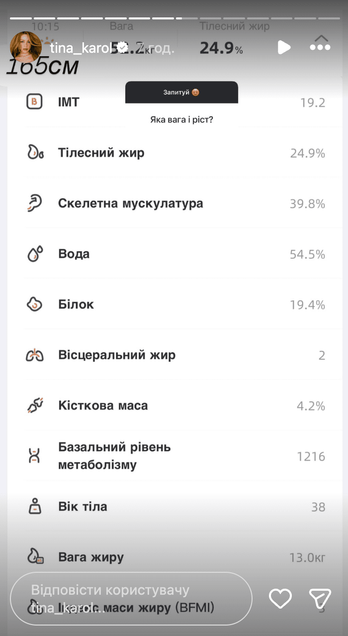 Днями зірка української сцени захотіла поспілкуватися зі своїми шанувальниками в Instagram та відповісти на їх питання. Один із підписників поцікавився її зростом і вагою. У відповідь Тіна Кароль не лише назвала цифри, а й опублікувала детальні дані зі свого фітнес-додатка — від відсотка м’язової маси та рівня води в тілі до кількості білка й показників жирової тканини.