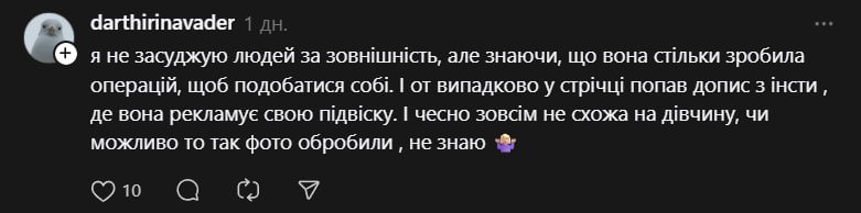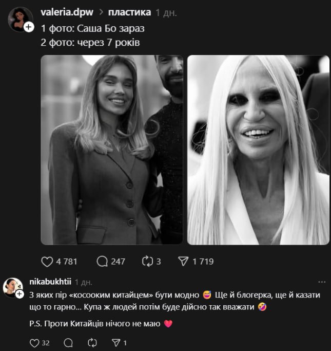 Водночас у дискусії з’явилися й ті, хто став на захист Саші Бо. Вони наголошують: якщо людині подобається її зовнішність, це її особиста справа, а публічні образи та приниження — точно не ок. Утім, загальний тон обговорень залишається доволі жорстким, і хвиля хейту навколо блогерки поки що не вщухає.