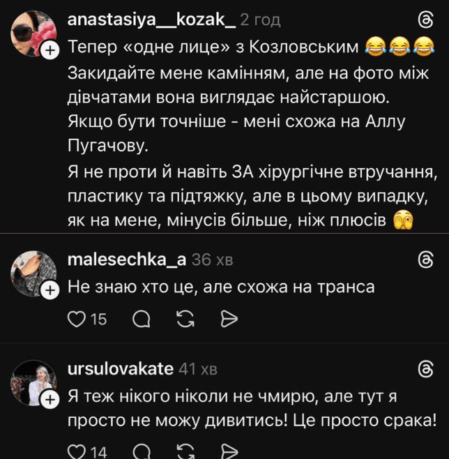 У коментарях думки розділилися. Частина аудиторії вважає, що раніше Саша була природно красивою й не потребувала втручань, а тепер її зовнішність стала “ляльковою”. Найбільше обговорень викликало порівняння з Віталієм Козловським — користувачі пишуть, що в них тепер “одне обличчя”.