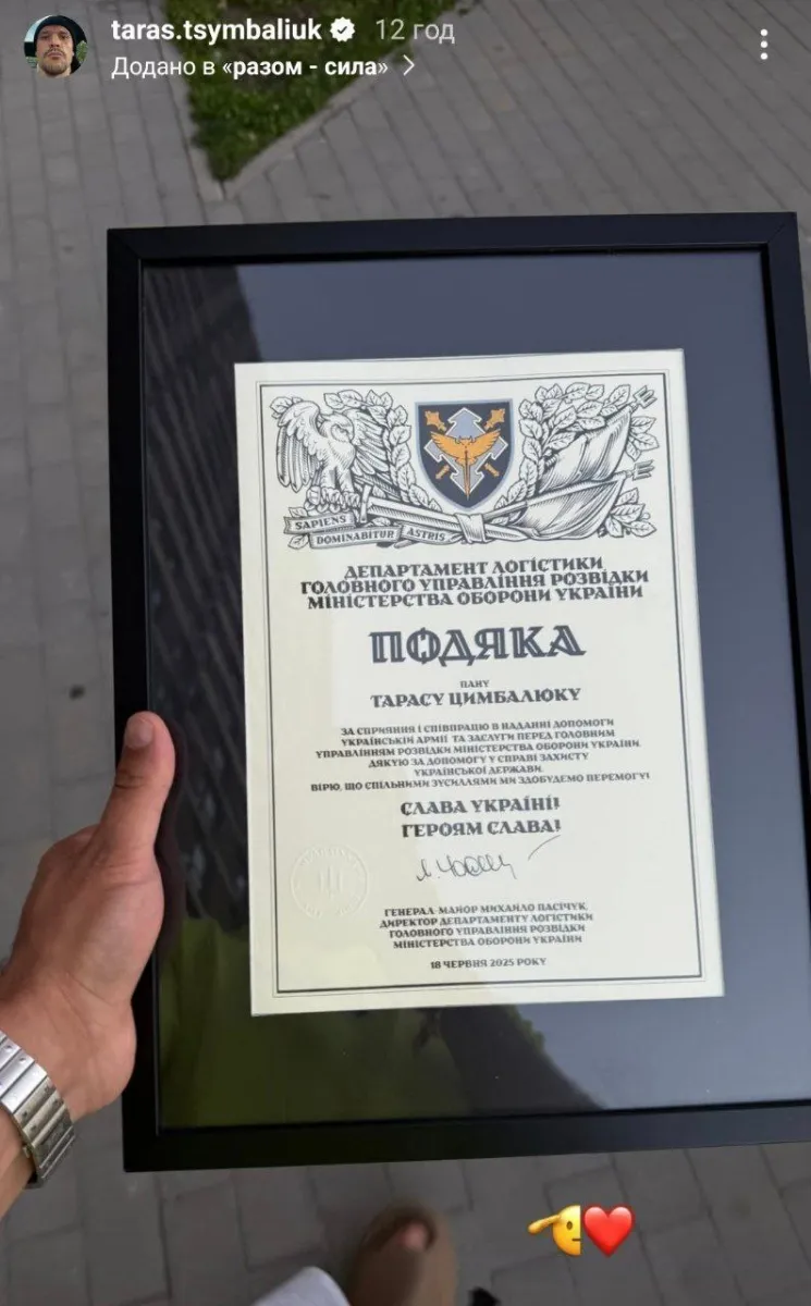 Про це він повідомив у своєму Instagram. Відомо, що актор співпрацює з ГУР та допомагає у підтримці українських військових. Подяку Цимбалюку підписав Михайло Пасічук, директор Департаменту логістики ГУР.