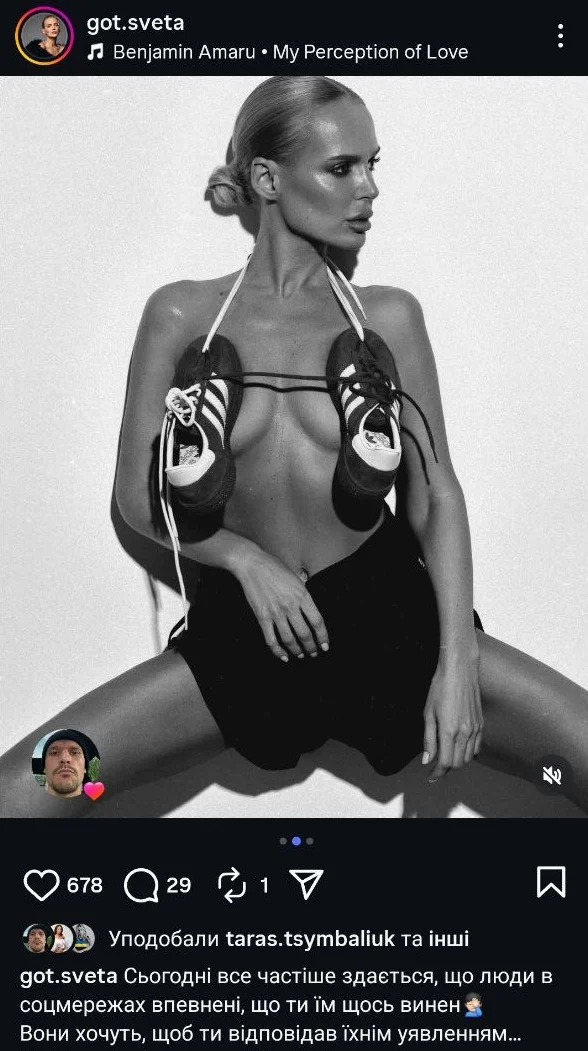 Цимбалюк узяв участь у показі нової колекції бренду своєї колишньої, і навіть вийшов із нею на подіум. Сам актор коментує це просто — мовляв, вони залишилися друзями, однак уважні підписники помітили: Тарас не лише підтримує проєкти Світлани, а й активно ставить лайки під її відвертими фото.