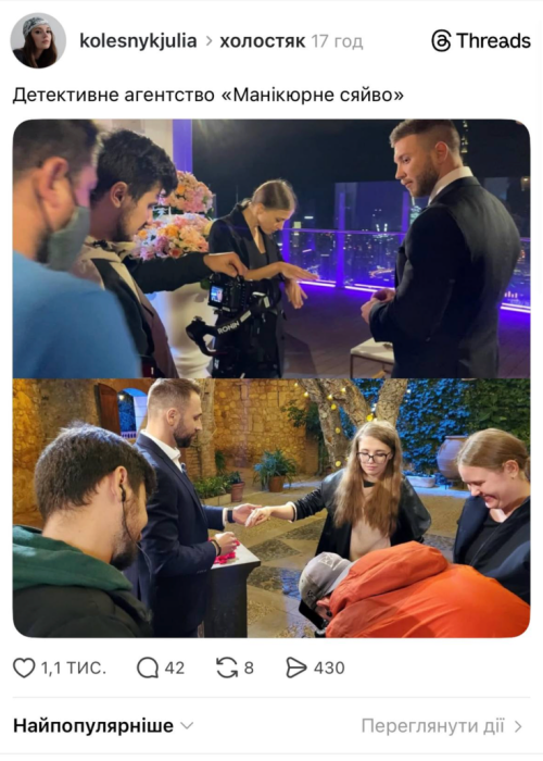 До обговорення долучилася навіть шоуранерка проєкту Юлія Колесник. Вона з гумором зауважила, що користувачі фактично відкрили “детективне агентство” під назвою “Манікюрне сяйво”.