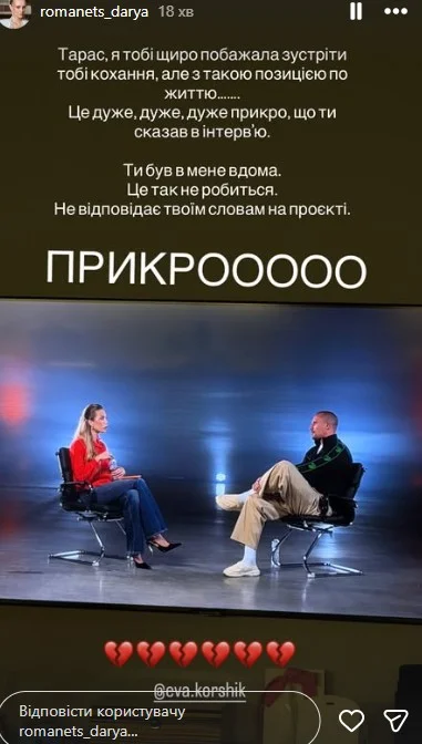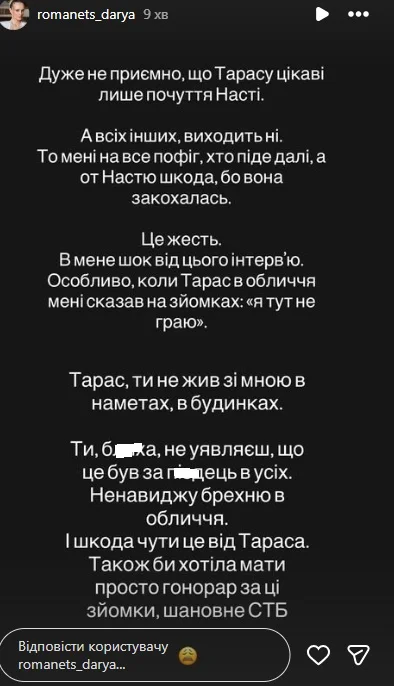 Дуже неприємно, що Тарасу цікаві лише почуття Насті. А всіх інших, виходить, ні. Це жесть. В мене шок від цього інтерв’ю. Особливо, коли Тарас в обличчя мені сказав на зніманнях: "Я тут не граю". Ненавиджу брехню в обличчя… Також би хотіла мати просто гонорар за ці знімання, шановне СТБ,