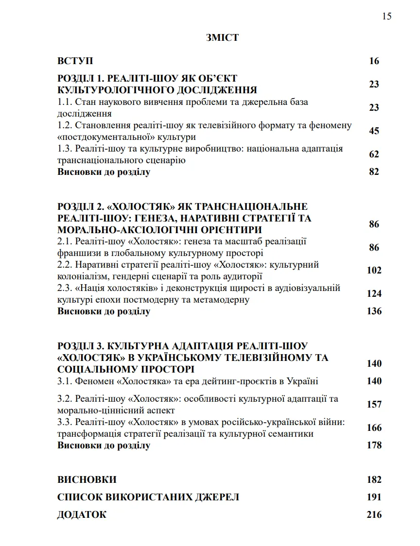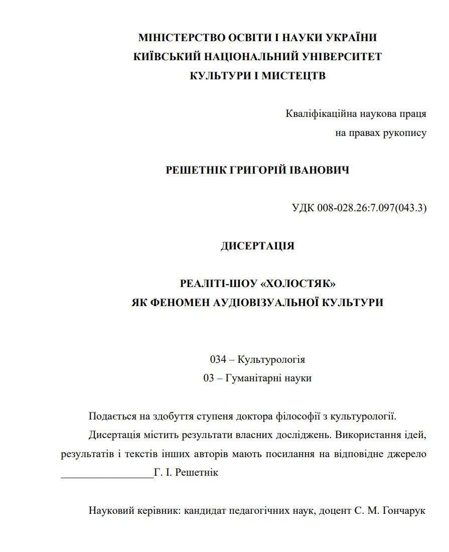 Дисертація обсягом 217 сторінок складається з трьох розділів: у першому йдеться про реаліті-шоу як культурне явище, у другому – про "Холостяка" як міжнародний формат, а третій присвячений українській адаптації проєкту. Ведучий наголошує, що реаліті на українському телебаченні формувалося під впливом західних форматів, які тривалий час транслювалися через російськомовний контекст.