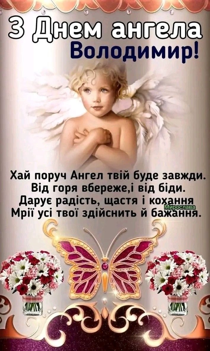 Володимире, вітаю тобі з іменинами! Бажаю, щоб твій ангел-охоронець завжди був поруч, вказував правильний шлях і допомагав долати будь-які труднощі. Нехай у твоєму житті панують гармонія, щастя та добробут.
