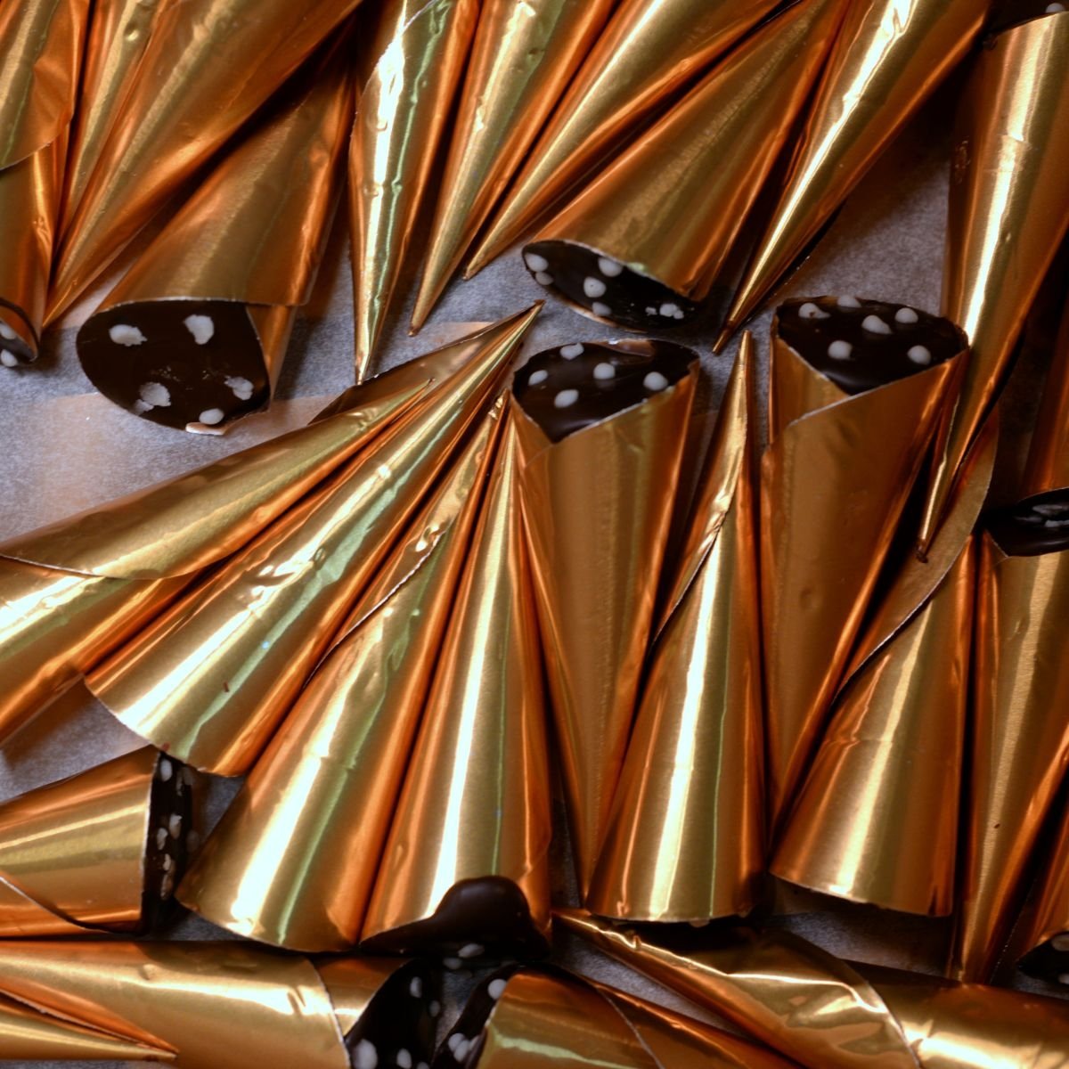 Це дуже дивний випадок, адже спочатку винайшли упаковку для цукерки, а вже потім розробили під неї солодощі. В Одесі кондитерській фабриці винайшли механізм, який формує ідеальний конус з кружечка фольги. І вже під це упакування розробили принципово нову цукерку.