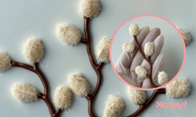 Темперованим білим шоколадом наливаємо на гілочки суцвіття-котики. Поки білий шоколад не застиг, швидко припорошуємо майбутні вербові гілочки кокосовою стружкою. Залишаємо до застигання.