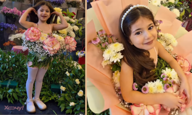 Для цього потрібна іменинниця, квіти, декоративний пакувальний папір, ножиці та гарна стрічка. Обирайте квітки та листя, які вам найбільше подобаються, і фіксуйте їх на одязі дитини. Усе гарно обмотайте святковим папером і закріпіть стрічкою. Готово!